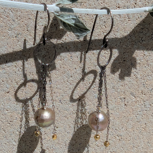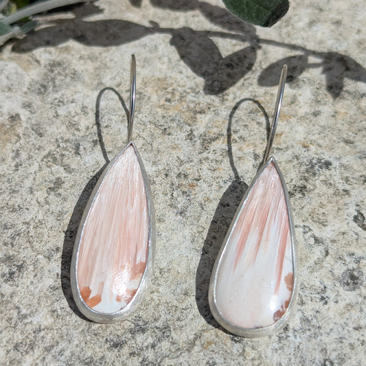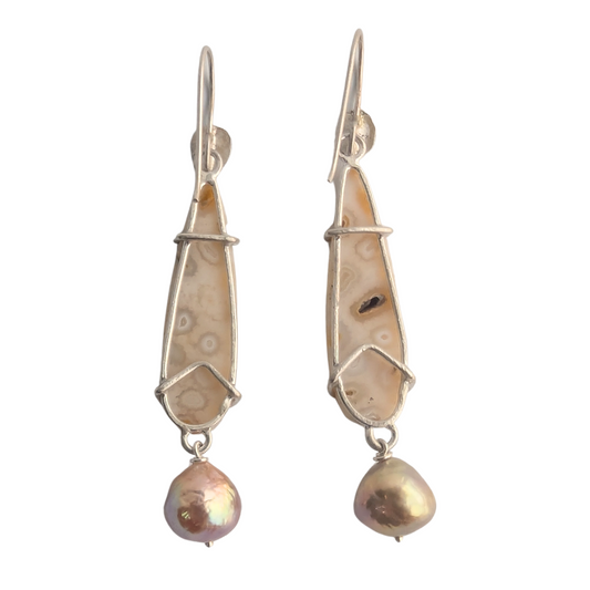 Silver Dangle Fossilized Coral Earrings with Pearl