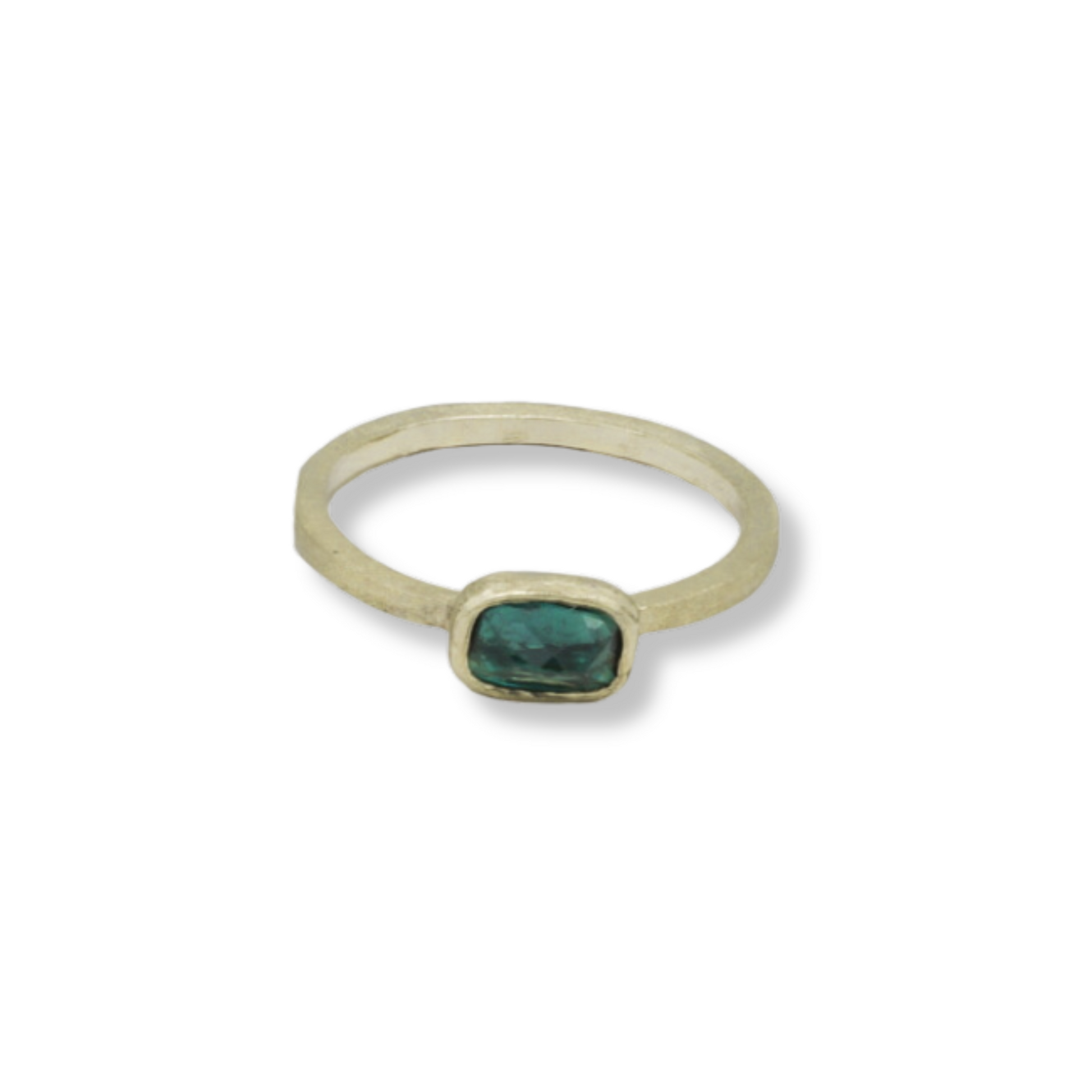 This ring crafted from a gold and silver alloy that creates a beautiful greenish color. The Karat is unknown as it is reclaimed from filings. This ring boasts a unique 0.25ct bluegreen square Andesine Labradorite. Its band is square and the stone measures 6x4 mm.