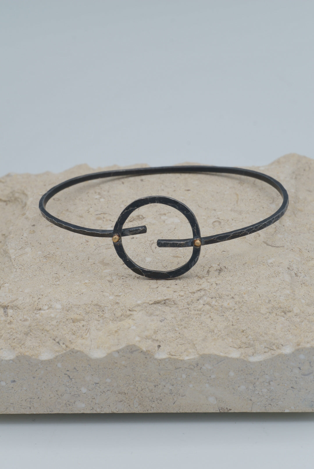 This bangle is made of Sterling Silver and comes with a circular adornment. To enhance its visual appeal, 18K gold balls are fixed on either side. Weighing 6.3g, the oval-shaped bangle is approximately 2.5" x 2.4" (medium size).