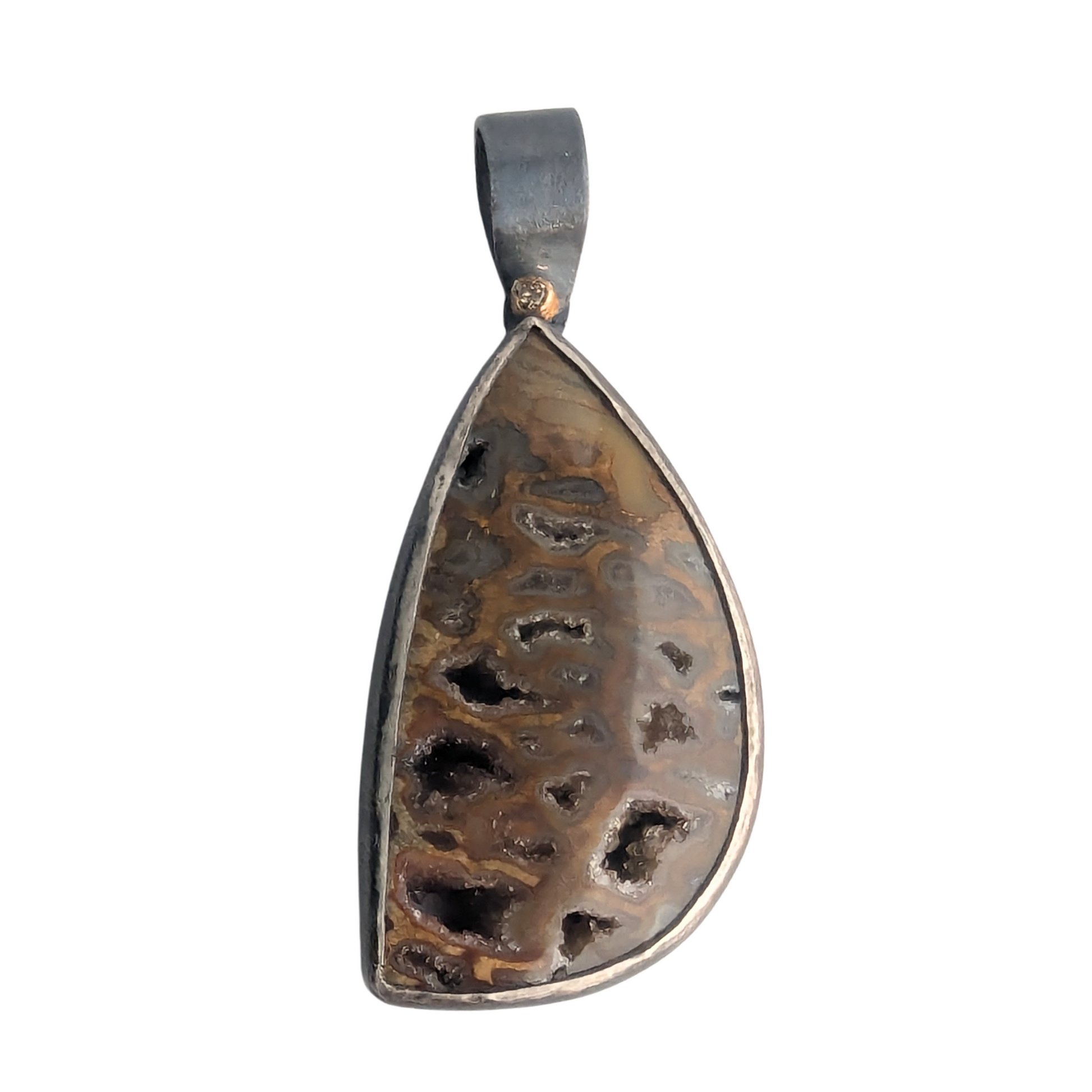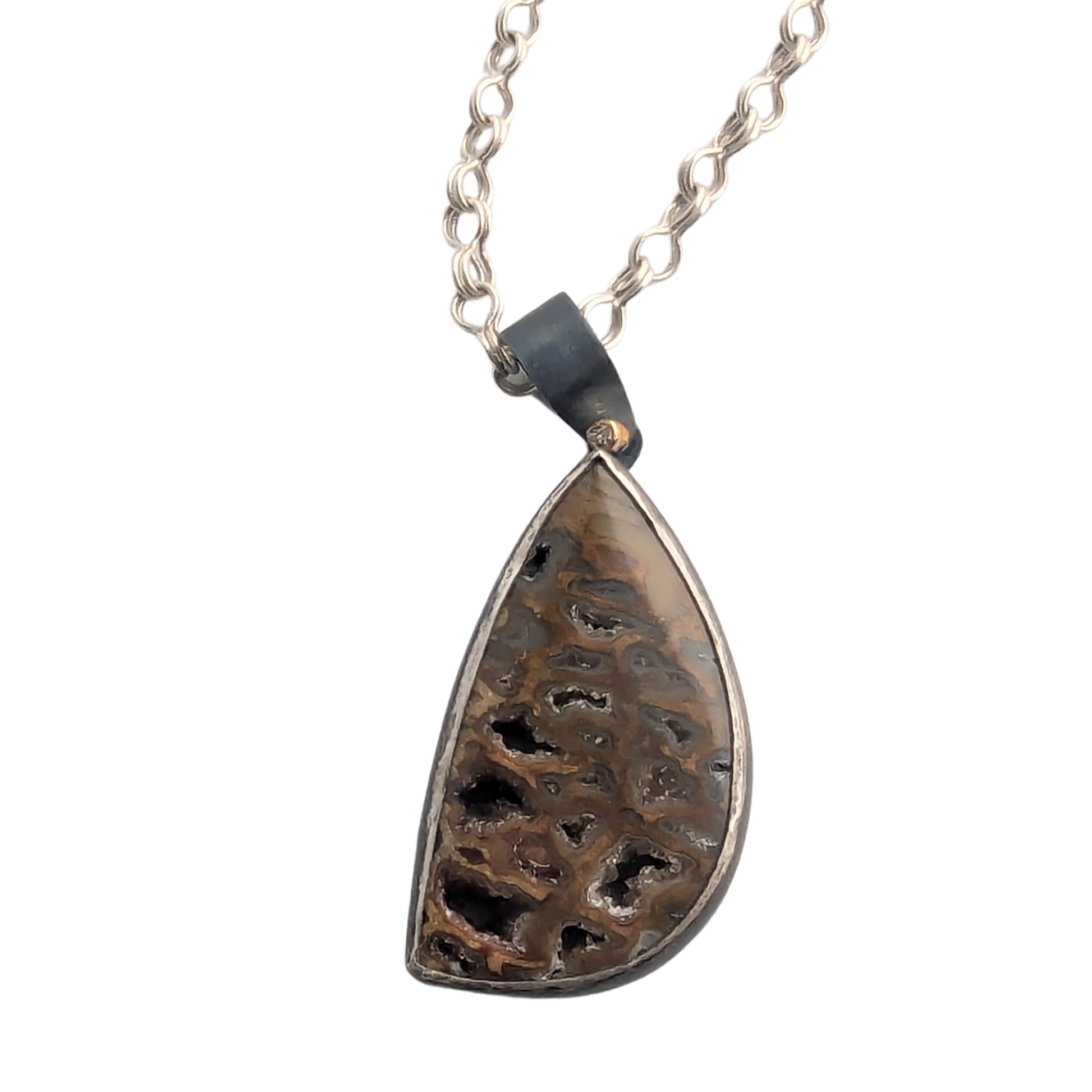 This free form fossilized wood with druzy holes works perfectly on a chunky silver chain (not included). The 2mm champagne diamond in a 18K gold bezel add a little pop of color to the dark brown and gray pendant.