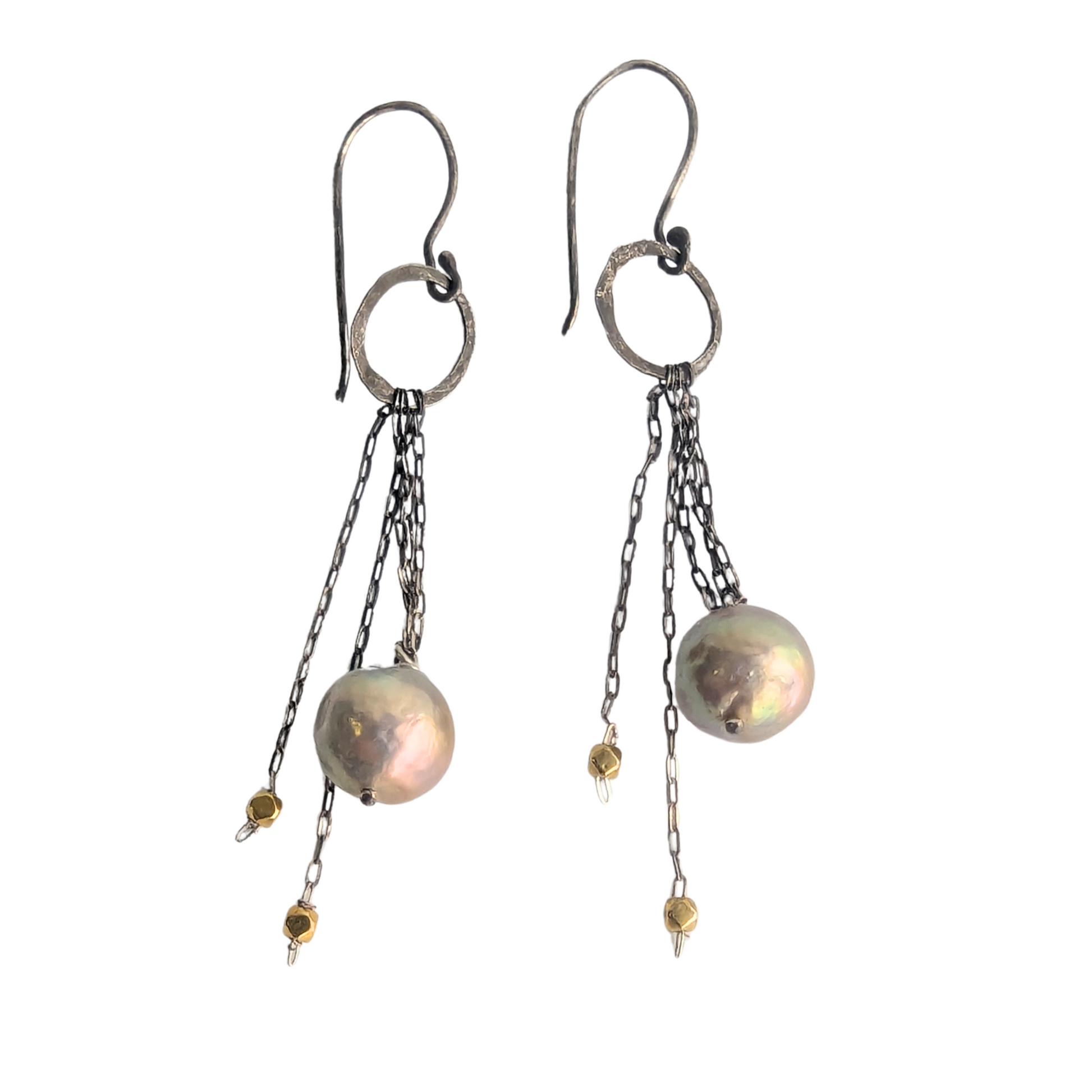 These earrings are light and fun. A Ming Fireball Pearl and two tiny 18K gold beads are dangling from a textured silver ring.