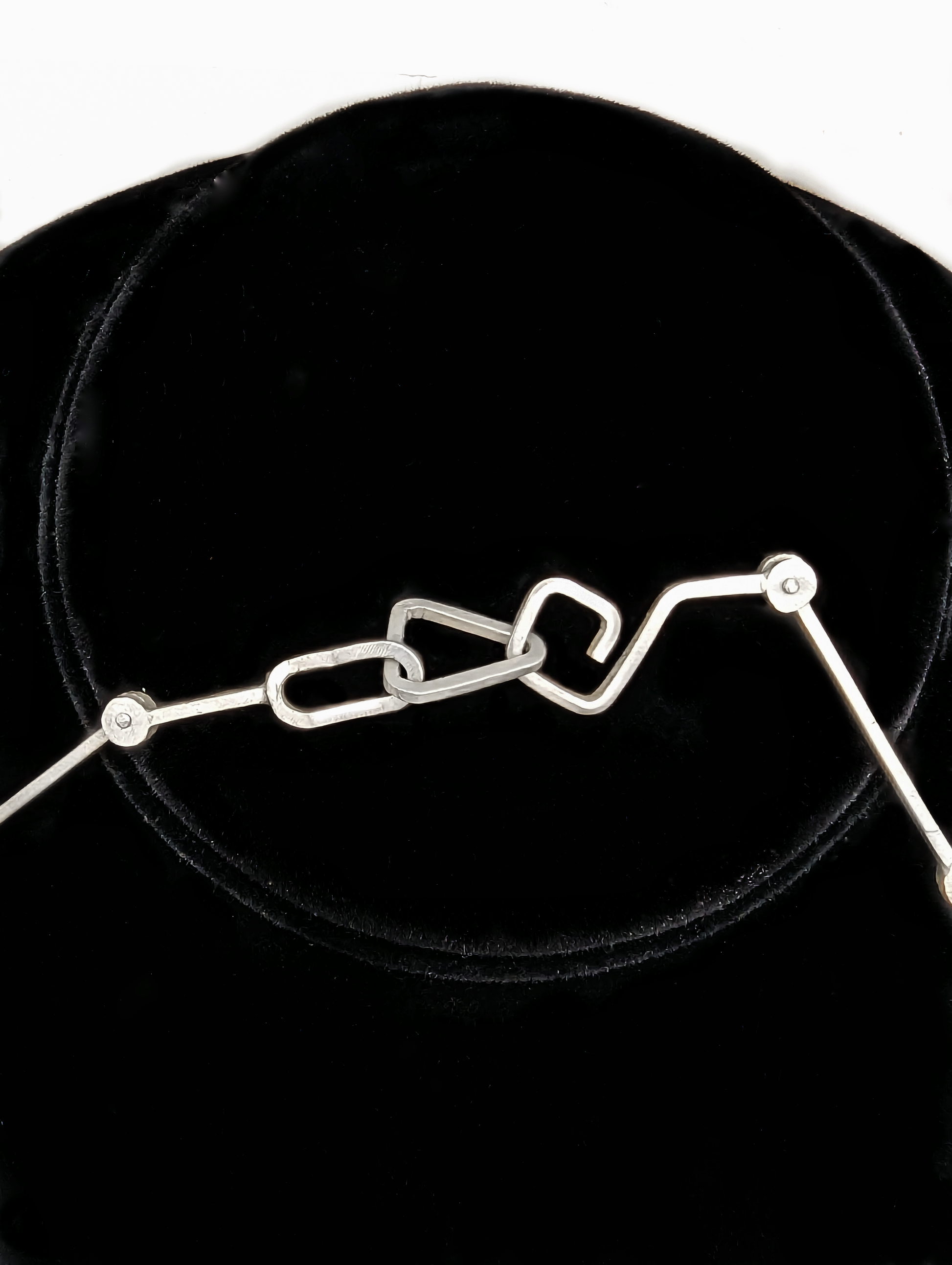 This necklace from the Sticks and Stones collection is unique due to the uncommon 2.3ct dark green Cat's Eye Tourmaline it features. With a shirt collar-like shape, it adds a touch of sophistication to even the simplest tops. The whole necklace is riveted which allows for movement. The clasp is handmade and is an interesting geometric hook and triangle design.