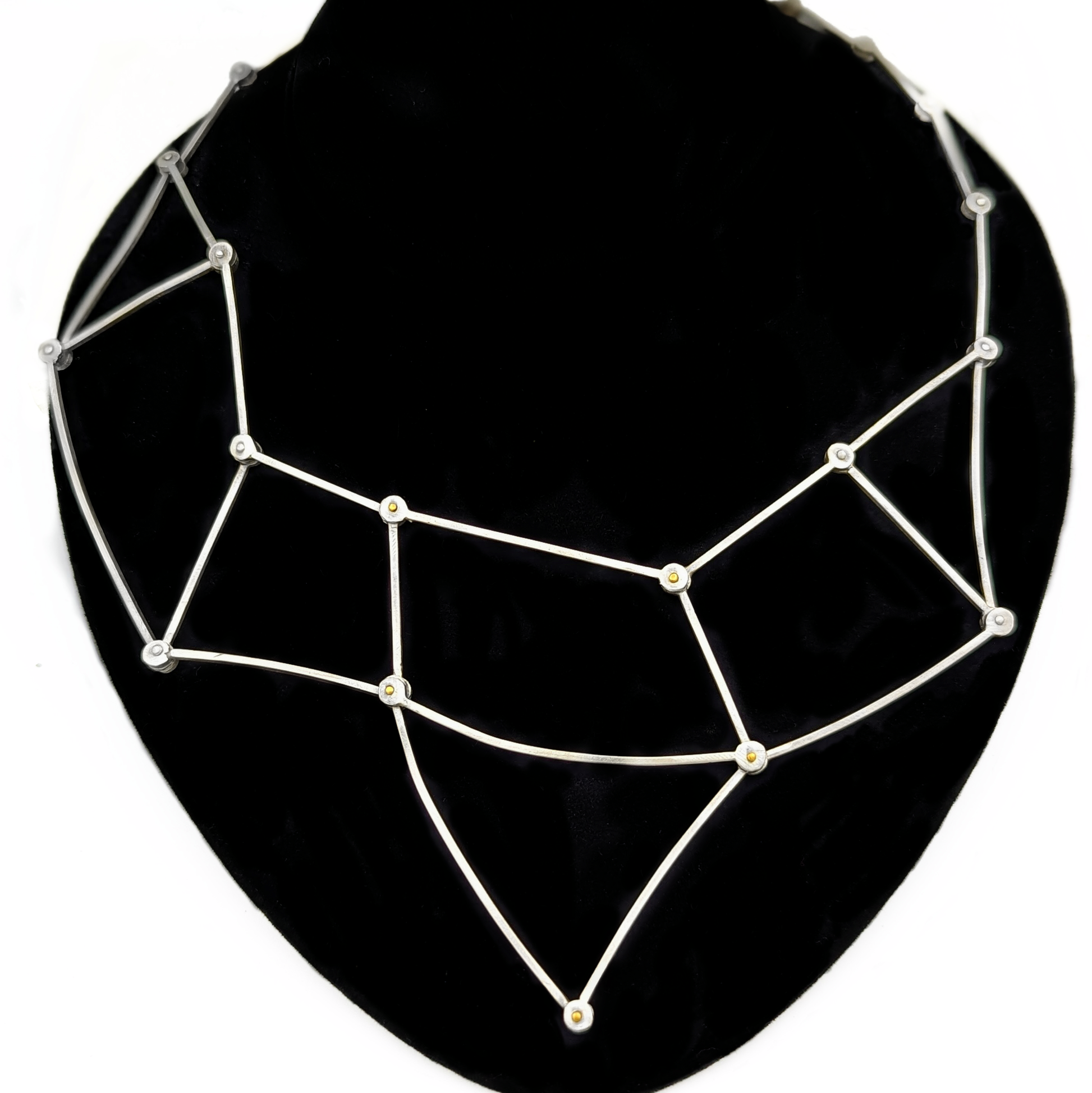 This unique piece of the Sticks and Stones collection offers an interesting combination; irregular geometric shapes in Sterling Silver, with 18K gold rivets in the front for a subtle touch of color. The unique handmade hook and square clasp provides an additional interest.