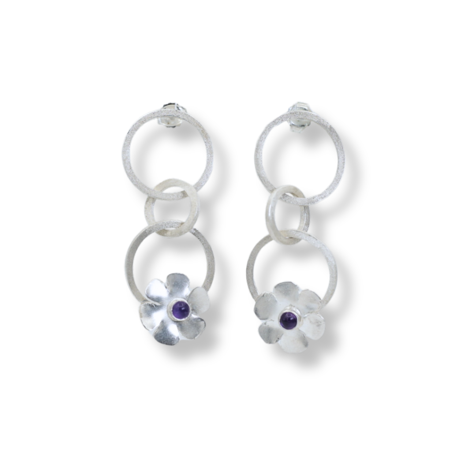 These Sterling Silver dangle earrings feature a dainty flower with a purple Amethyst center. The flower sits at the bottom of three square rings. These stud earrings add a playful touch to any outfit.