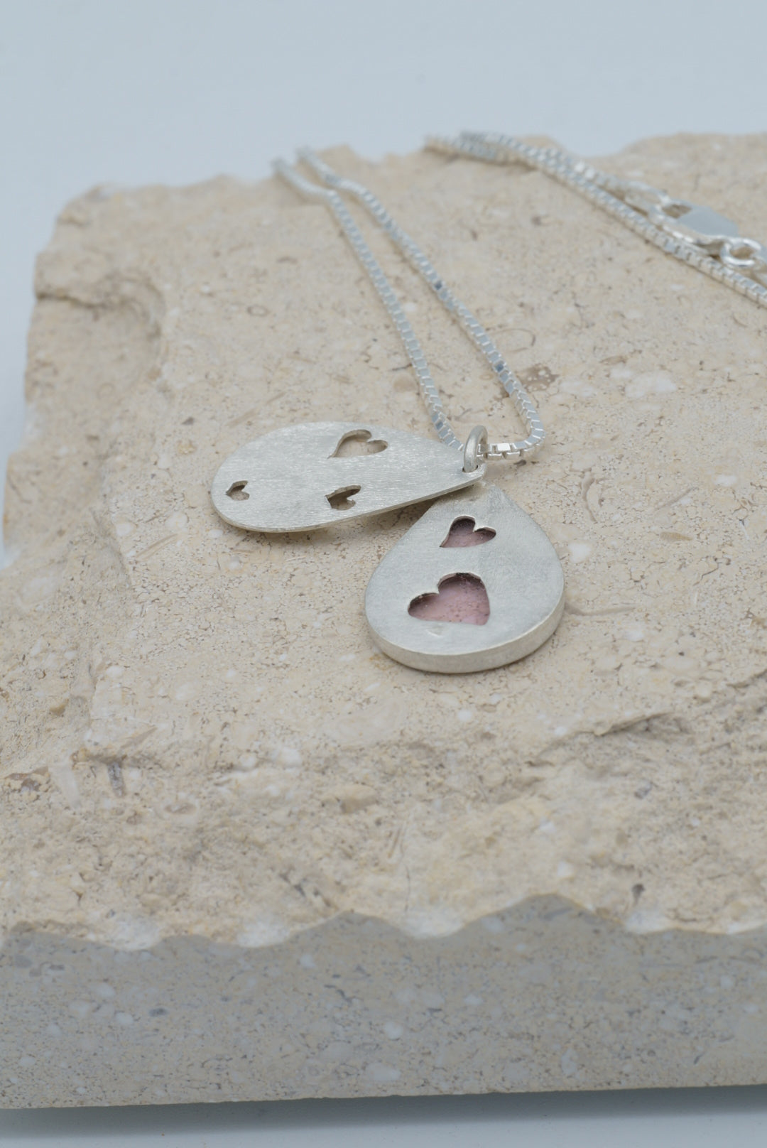 This unique cut of light pink Tourmaline is showcased in a sterling silver pendant with two hearts as its backdrop. An extra special silver leaf with pierced hearts is hidden behind. The weight of the Tourmaline is 4.35ct. The stone has some natural inclusions.