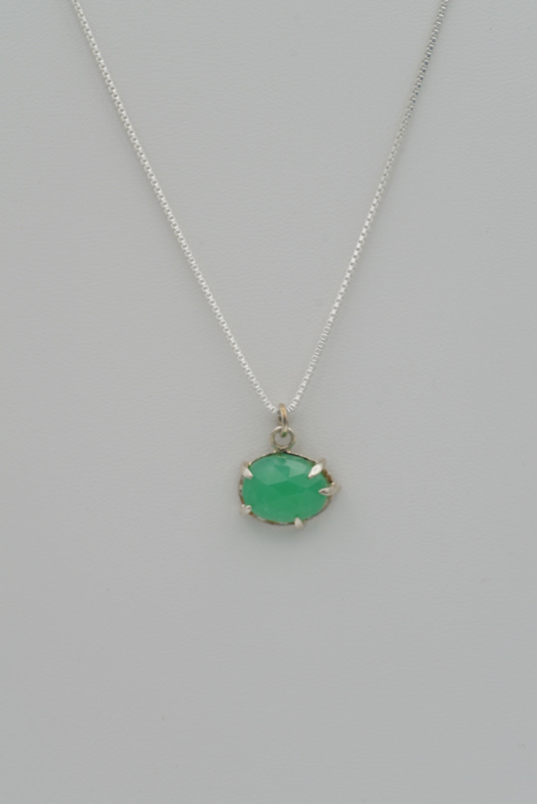 This Sterling Silver pendant features a luminous green cabochon stone held in place with a five-prong setting.