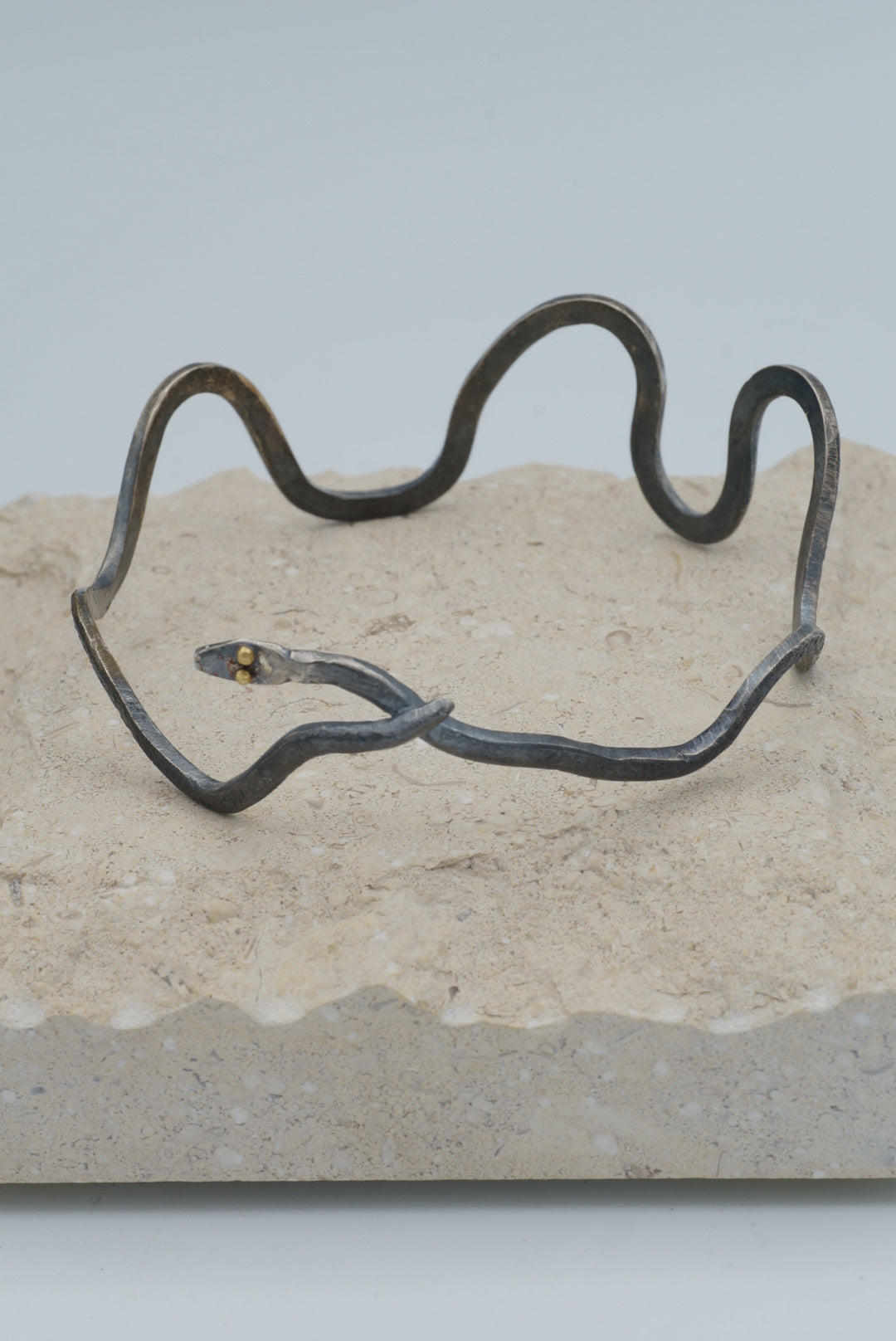 This Sterling Silver bangle is crafted with a subtly textured, undulating snake shape, complete with two golden eyes crafted from 18K gold. Its dimensions are 2.5"x2.4" which makes it a medium size.