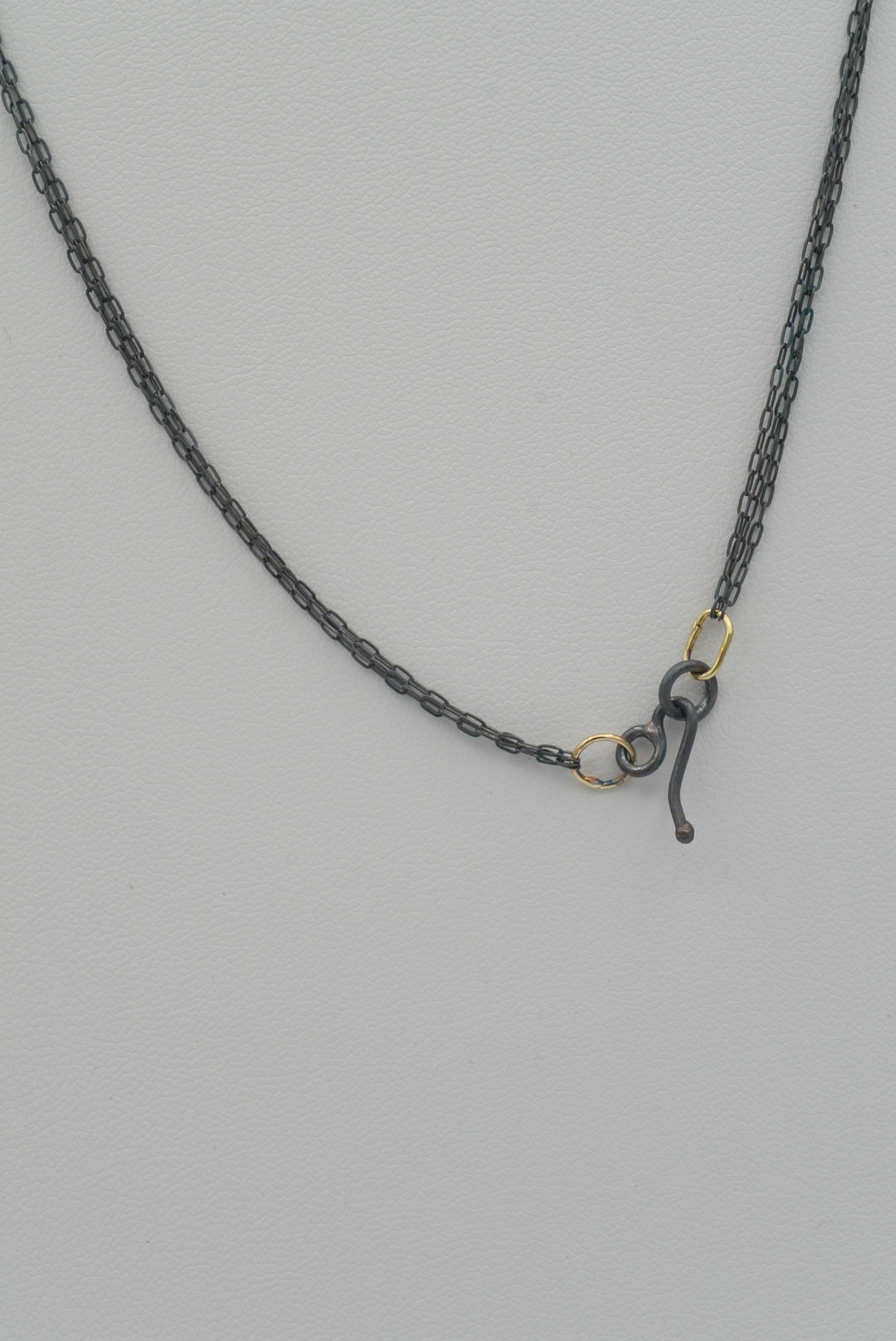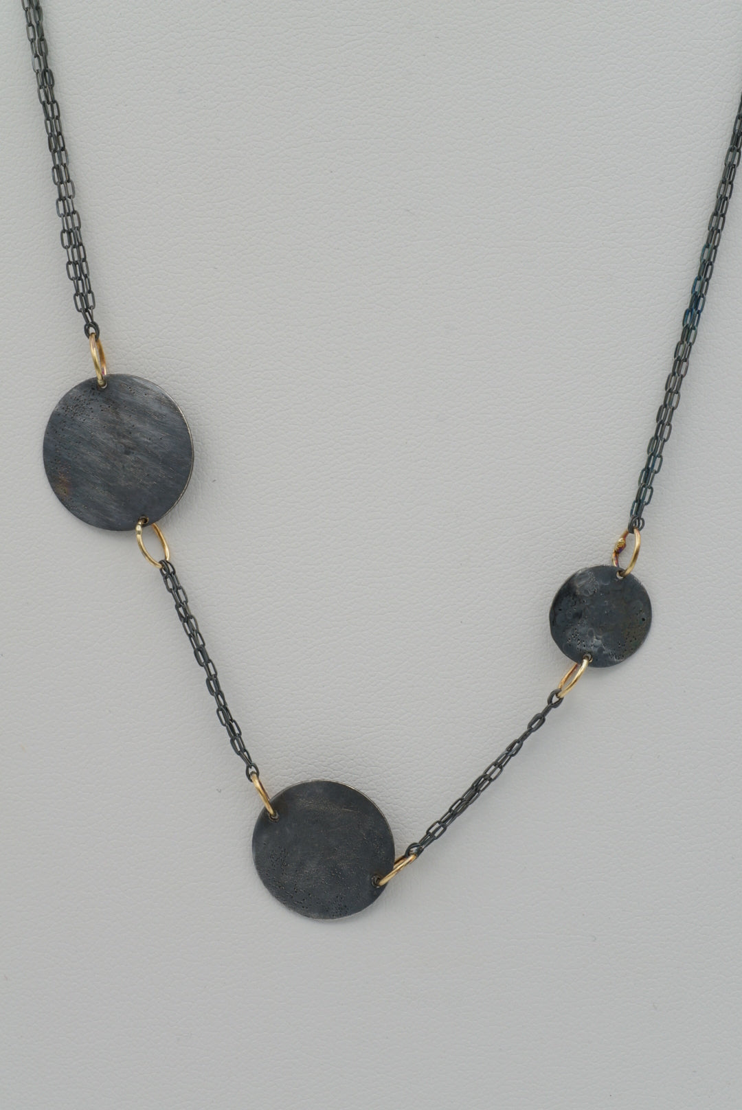 This beautiful necklace features three intricately textured moons, joined together by 18K gold jumprings, three strands of chain and a handmade clasp.
